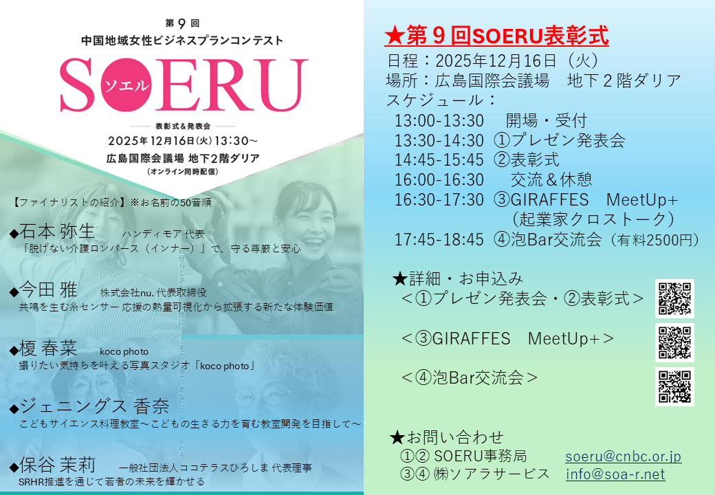第9回中国地域女性ビジネスプランコンテストSOERU表彰式を下記の通り開催いたします。ぜひご参加いただき、受賞者へのエールをお送り願います。